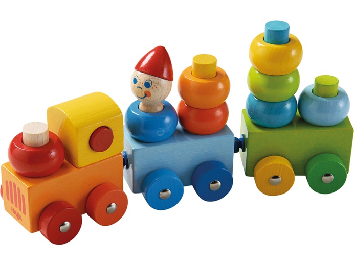 Der Entdeckerzug Farbkringel ist ein Steckspiel mit vielen Variationsmöglichkeiten. Die bunte Ladung lässt sich auf den beiden Waggons immer wieder neu zusammenstellen. Dann steigt noch der Fahrer ein und schon geht es los, Das Steckspiel fördert die Feinmotorik und die Fähigkeit, Farben zu erkennen und zu benennen.