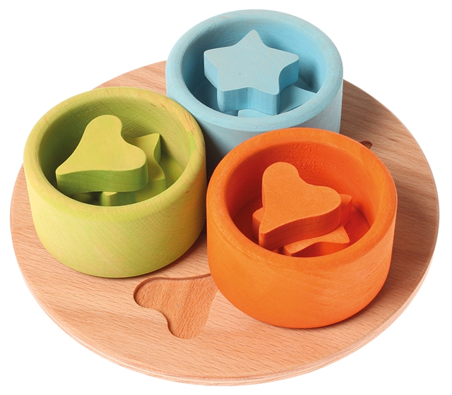 Das kleine Sortierspiel mit 3 Schälchen von Grimms fördert die Feinmotorik und die Auge-Hand Koordination der Kinder. In die Ausfräsungen in dem Holzrahmen können die Formen geordnet werden.