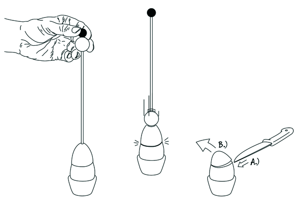 Metallkappe auf`s gekochte Ei setzen und die Schlagkugel am Führungsstab frei fallen lassen. So erhält die Eierschale eine ringförmige Bruchstelle, an der sich nun leicht die Ei-Kappe mit einem Messer abheben lässt.