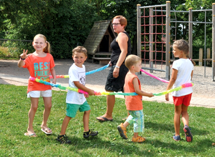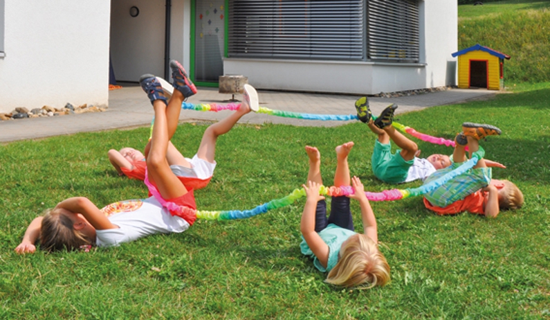 Mit dem elastischen Kooperationsband können drinnen wie draußen tolle Gemeinschaftsspiele erlebt werden: aufeinander zugehen, sich gemeinsam im Kreis bewegen, Sternformen bilden, im Sitzen die Füße nach oben strecken und dabei das Band mit den Füßen halten ... Dabei lernen die Kinder das soziale Miteinander. Waschbar. Belastbar bis 100 kg.