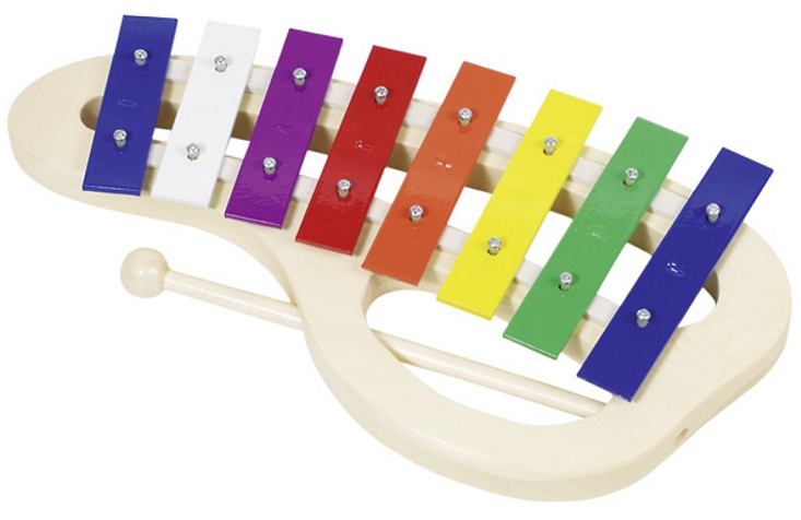 Dieses gebogene Xylophon mit gut klingenden Metallplatten hat einen praktischen Griff und kann so leichter herumgetragen bzw. gehalten werden. Durch die farbigen Klangplatten lassen sich die einzelnen Töne leichter merken. Die Notenbezeichnung steht auf den Plättchen. Leider gibt es aber kein passendes Notenheft dazu. Der Schlägel lässt sich direkt am Instrument einstecken und hilft so vielleicht ein wenig die Verlustquote zu verringern.