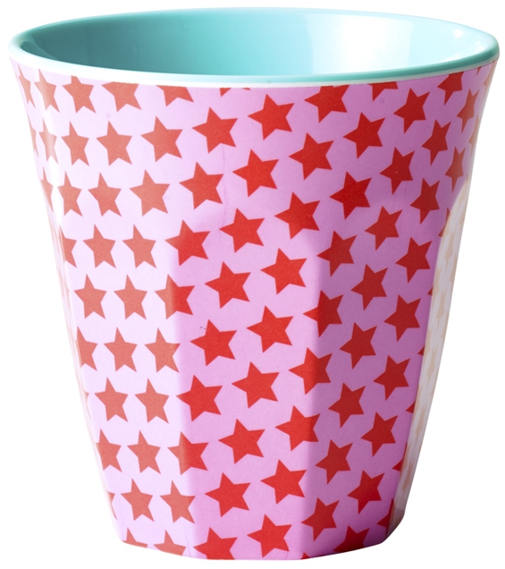 Der Melaminbecher Sterne pink gehört zu den zweifarbig bedruckten Melaminprodukten von Rice. Diese sind etwas dickwandiger als die einfarbigen. Außen ist der Becher rosa mit vielen roten Sternen, innen ist er türkis. Auch zu dieser Geschirrserie Star Girl gibt es weitere Produkte