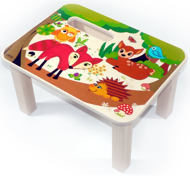 Mit Waldtieren bedruckte Fußbank aus Buche und Birkensperrholz. Dieser tolle Holzhocker eignet sich für die Hilfe am Herd genauso wie fürs Zähneputzen. Oder man setzt sich einfach auf ihn.