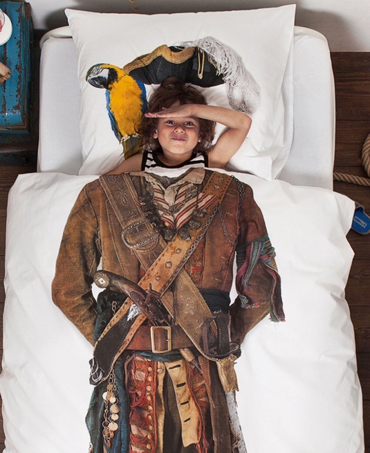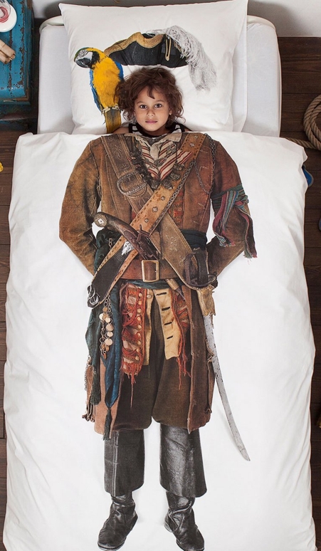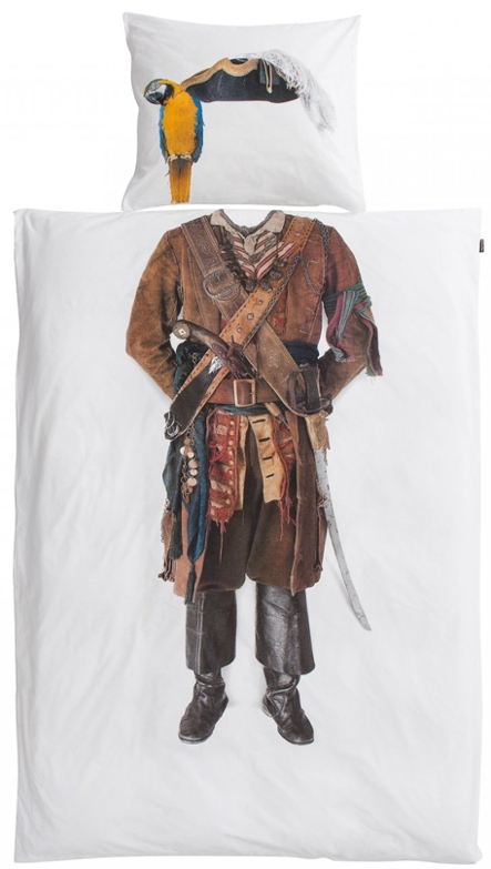 Hier schläft der mutige Pirat. Da traut sich keiner etwas aus dem Zimmer zu stehlen. Die Bettwäsche Pirat von Snurk für alle kleinen Räuber auf den Weltmeeren.