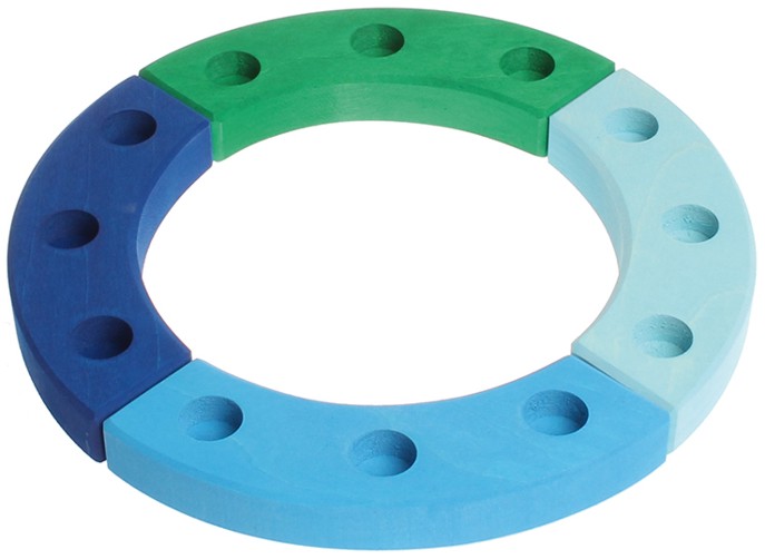 Ein besonders schöner Schmuck für den Geburtstagstisch. Bei dieser Ausführung hat jedes Element eine eigene Farbe, von hellblau bis grün. Die Elemente können auch einzeln aufgestellt werden. Dieser Geburtstagsring hat 12 Löcher für die individuelle Dekoration mit Kerzen, Zahlen- und Figurensteckern.