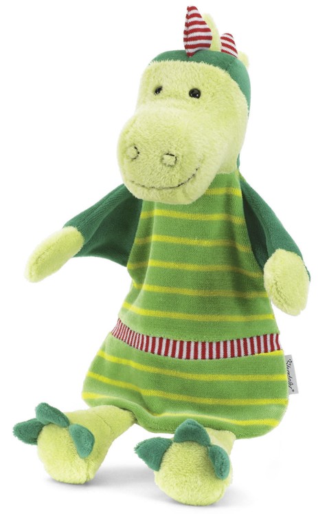 Die Handpuppe Drache ist etwa 31 cm gross. Der Nicki besteht zu 80% aus Baumwolle und zu 20% aus Polyester. Der Flausch besteht zu 100 % aus Polyester.