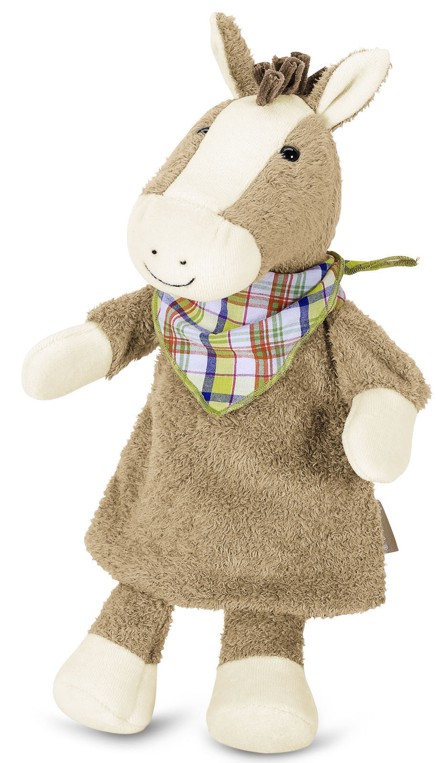 Die Handpuppe Pferd ist etwa 31 cm gross. Der Nicki besteht zu 80% aus Baumwolle und zu 20% aus Polyester, der Baumwollstoff zu 100 % aus Baumwolle. Der Flausch besteht zu 100 % aus Polyester.
