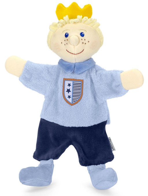 Die Handpuppe Prinz ist etwa 31 cm gross. Der Nicki besteht zu 80% aus Baumwolle und zu 20% aus Polyester.Der Flausch besteht zu 100 %aus Polyester.