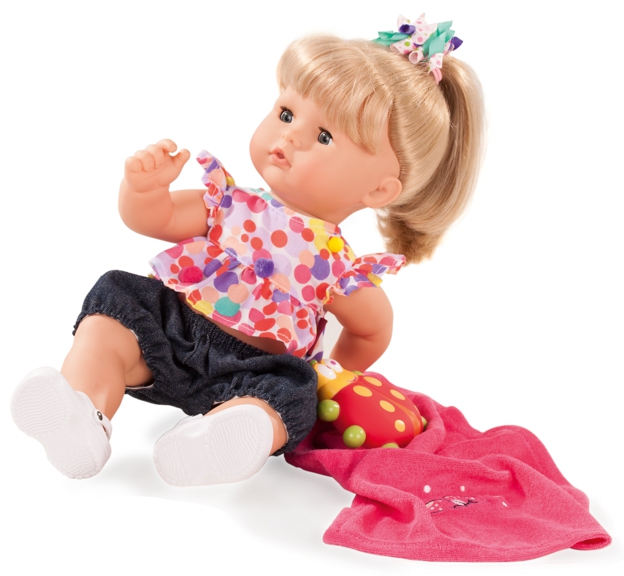 Zum Lieferumfang gehören: Die Puppe, der Sommeranzug, die Dollocs, ein Tuch, ein Wasserspielzeug, ein Schnuller und eine Haarschleife.