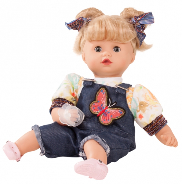 Muffin Macaron von Götz ist eine 33 cm große Babypuppe mit blonden Haaren und blauen Schlafaugen. Gefüllt ist die Puppe mit flauschiger Watte und Granulat.