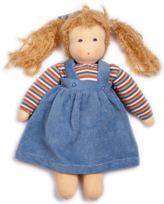 Wie alle Puppen von Nanchen Natur ist die Anziehpuppe Wolke mit dem blauen Trägerrock besonders weich und kuschelig.