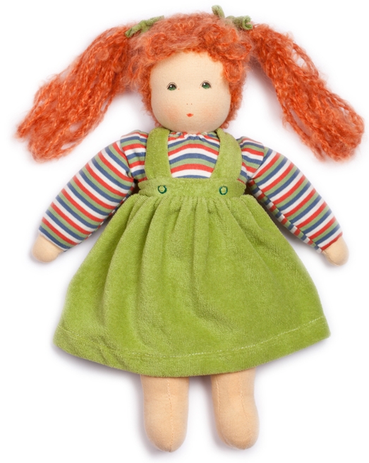 Das Mädchen Wolke mit grünem Trägerrock ist eine weiche Puppe von Nanchen Natur zum Spielen, Knuddeln und Kuscheln. Hergestellt wird sie aus Baumwollfrottee und Baumwolljersey aus kontrolliert biologischem Anbau (kbA), gefüllt wird das Püppchen mit Bioland Schafschurwolle aus kontrolliert biologischer Tierhaltung (kbT).
