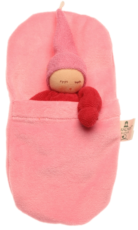 Der rote Wichtel im rosa Schlafsack ist eine erste Schmuse- und Kuschelpuppe aus kontrolliert biologischer Baumwolle von Nanchen. Und der kuschelige Schlafsack ist gleich mit dabei. Die Augen des Wichtels sind geschlossen.