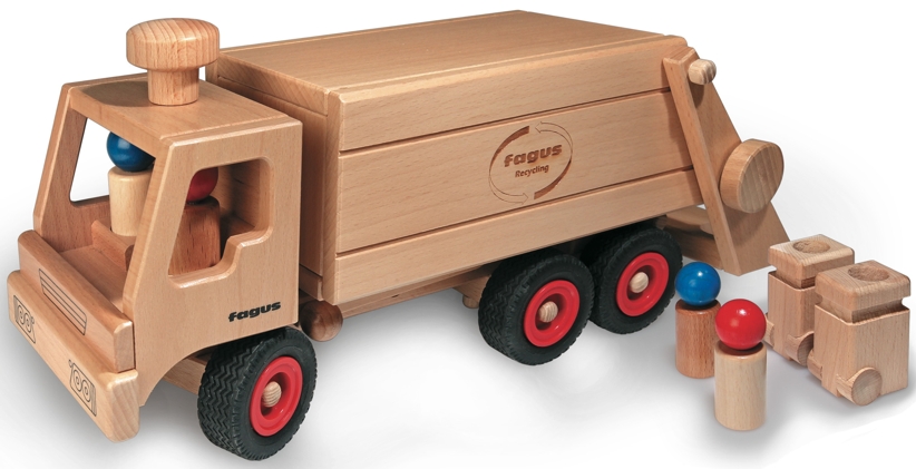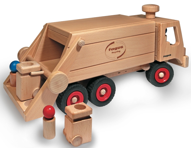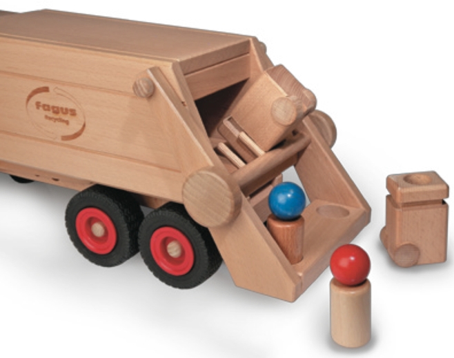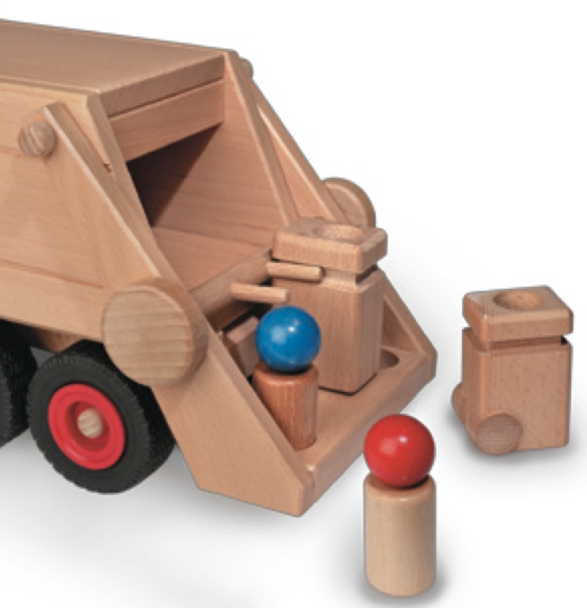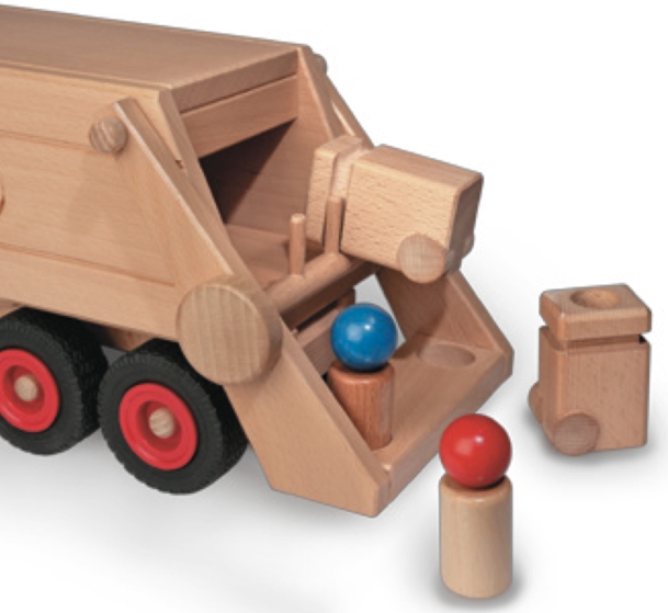 Der Müllkipper hat eine doppelte Hinterachse und ist lenkbar. Die Mulde und und die Mülltonnenhalterung sind kippbar. Dadurch kann sehr realitätsnah gespielt werden. 4 Püppchen und 2 naturfarbene Mülltonnen gehören bei diesem Müllkipper mit zum Lieferumfang. Gelbe und blaue Mülltonnen können zusätzlich erworben werden.