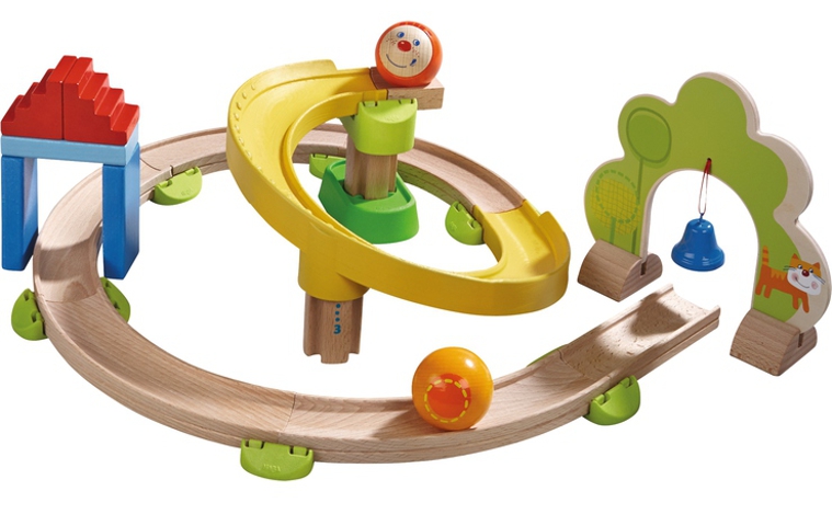 Die Kringelbahn der HABA-Kugelbahn Kullerbü macht ihrem Namen wirklich alle Ehre! Gleich mehrere Kurven sorgen für eine Extraportion Kringelspaß. Ein Schups genügt, und Kugel Paul stürzt sich in die Steilkurve, um dann schwungvoll durchs Tor zu sausen und am Ende der Kringelbahn das Glöckchen-Tor zu passieren. Mit einem fröhlichen „Klingeling“ läutet das Glöckchen das Ende der munteren Fahrt ein. Wer weiterspielen möchte, kann die Kringelbahn beliebig mit jeder anderen Kullerbü-Kugelbahn ergänzen. Dank cleverem Klicksystem bleibt die gesamte Bahn sicher stehen, kein Element verrutscht. Also nichts wie auf zur nächsten Kringelrunde.
