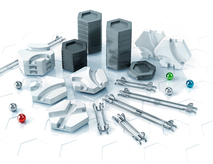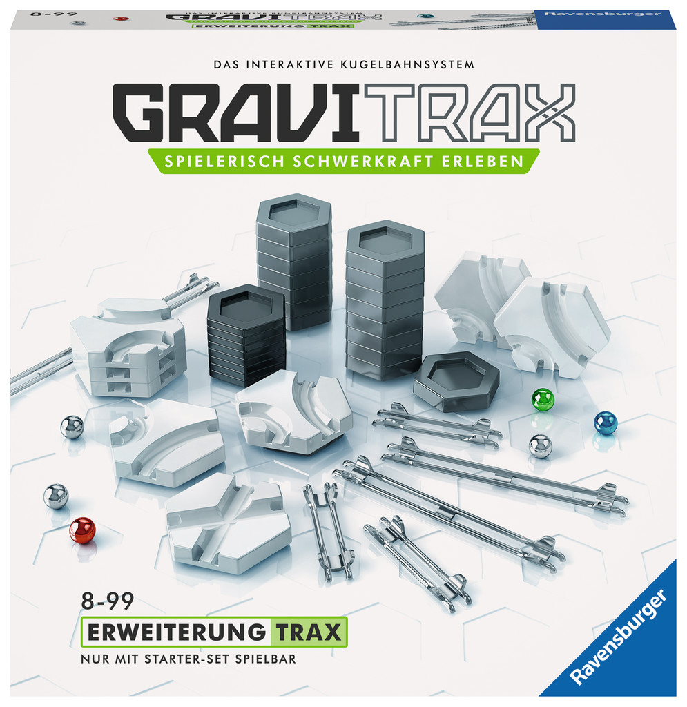 Mit der Erweiterung Trax haben Sie mehr Höhensteine, Kurven und Schienen und können so ihre GraviTrax-Kugelbahn vergrößern und erweitern.