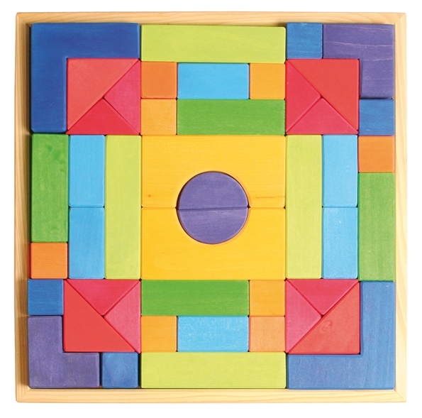 Der Baukasten besteht aus 46 Bauklötzen im Holzrahmen.