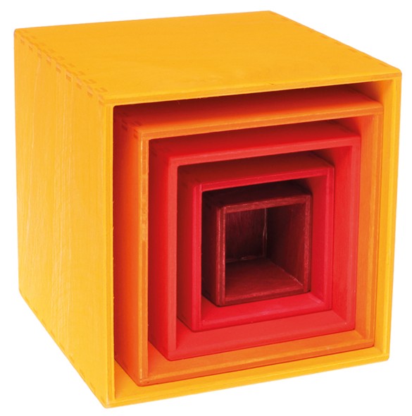 Der kleine Kistensatz ist wie der Große einsetzbar, hat aber eine Kantenlänge von nur 10 cm. Bei dieser Ausführung ist die größte KIste gelb.