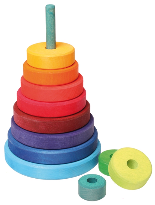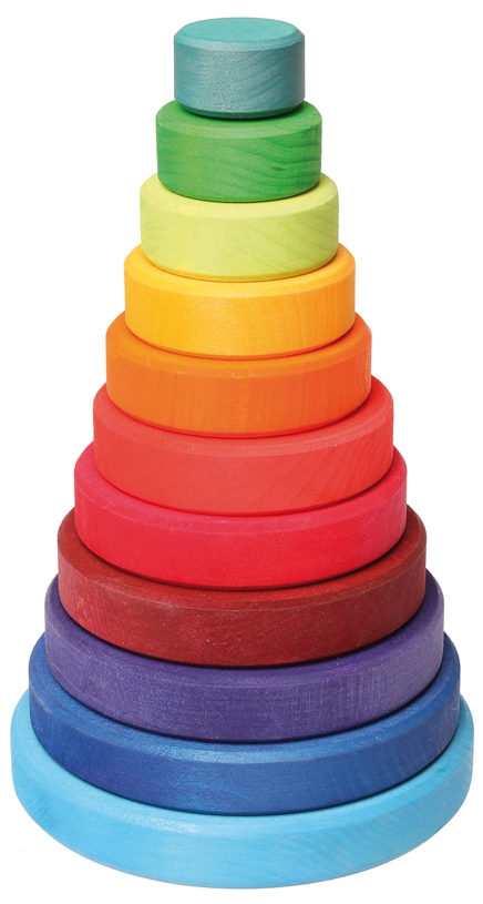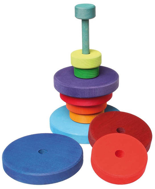 Der große Scheibenturm von Grimms besteht aus zehn unterschiedlich großen, farbigen Scheiben zum Stecken.