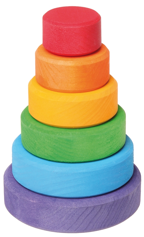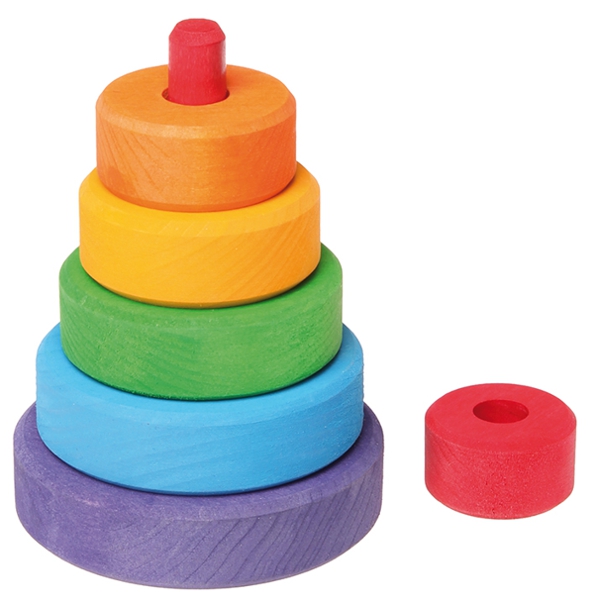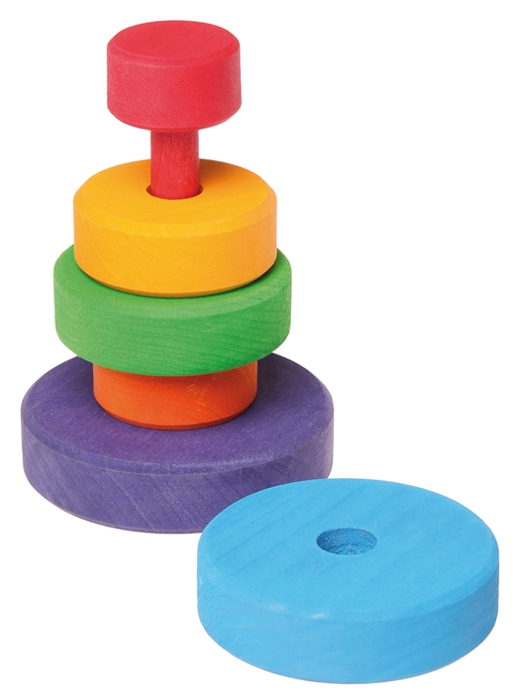 Der kleine Scheibenturm von Grimms besteht aus 5 unterschiedlich großen, farbigen Scheiben zum Stecken.
