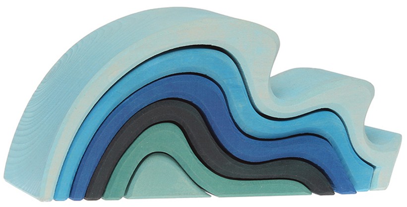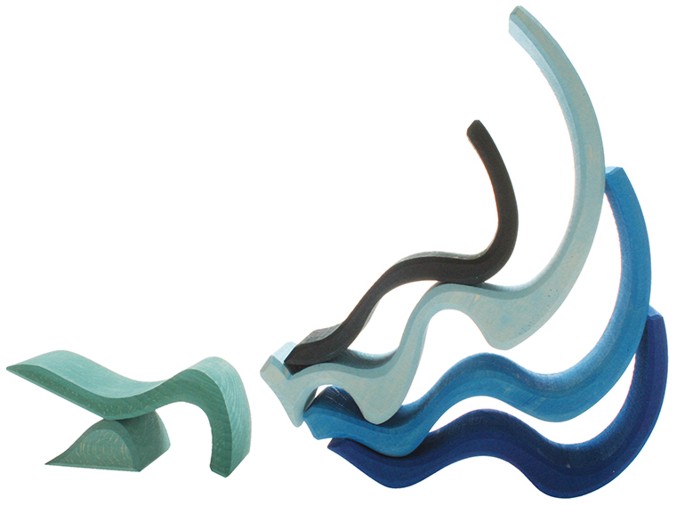 Die großen Wasserwellen sind wie die Regenbögen ein sehr vielseitiges Spielzeug und schon für Krabbelkinder wunderbar zum Spielen geeignet. Die Kleinen stapeln, bauen und sortieren. Wenn die Kinder älter sind kann man damit Wasser wogen lassen, Zäune, Tunnel, Brücken, Häuschen und Skulpturen bauen, und und und.