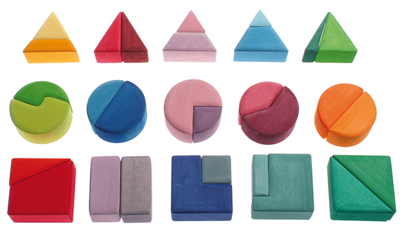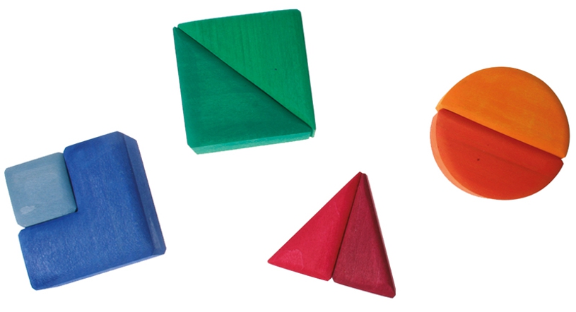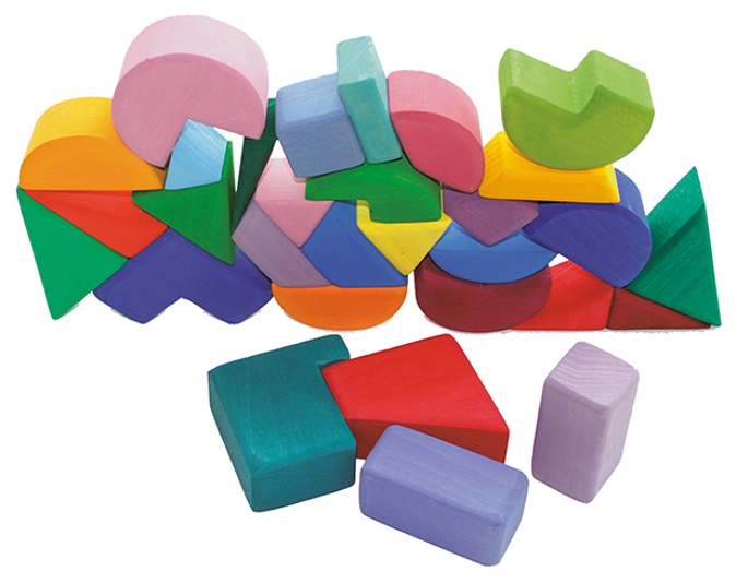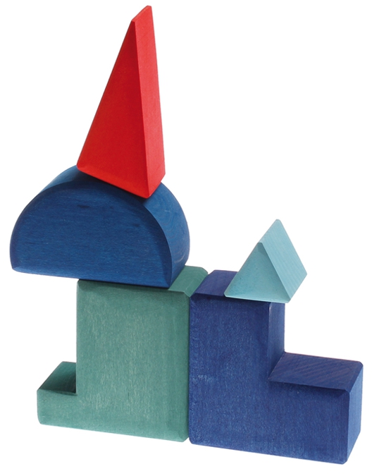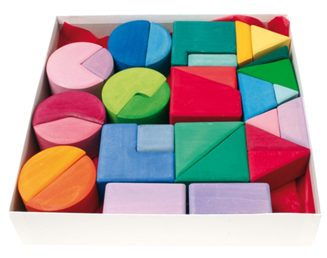 Diese Bauklötze mit den Grundformen Prisma, Quader und Zylinder lassen die Kinder spielerisch Mathematik begreifen. Hier kann man Tiere bauen, Grundformen ergänzen und vieles mehr entdecken... verschiedene Spielideen liegen bei.