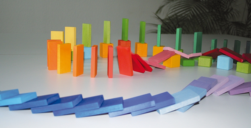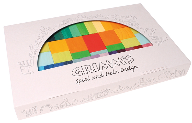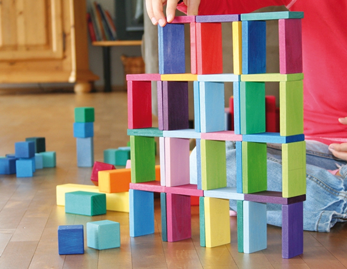 Die Farbtafel Rally von Grimms ist ideal, um mehrstöckige Bauwerke zu schaffen. Auch Muster und Reihen für den Domino-Effekt lassen sich damit erschaffen. Und ganz nebenbei lassen sie sich hervorragend zur Förderung eines harmonischen Farbempfindens einsetzen.