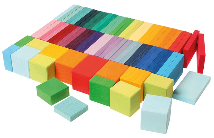 Maße: Farbplättchen 1 cm Stärke und 4 cm Breite, Länge 8 cm. Stufenbauklötze 4 cm Stärke, Länge 1-6 cm.