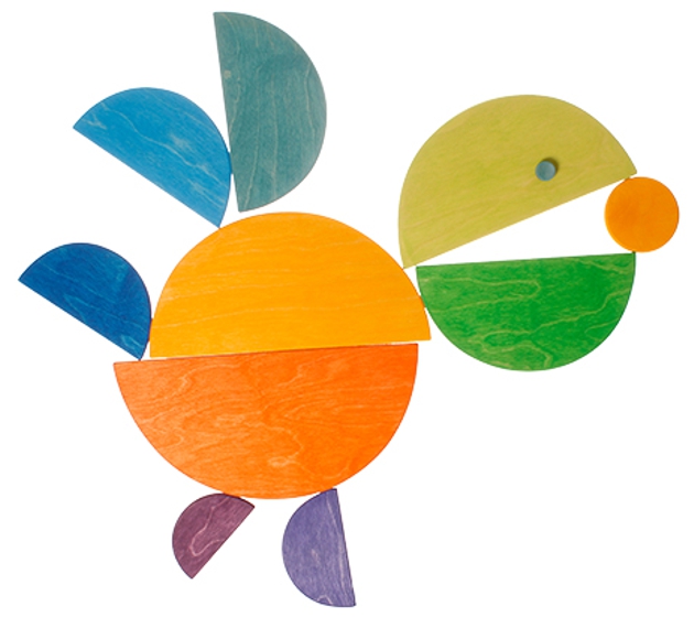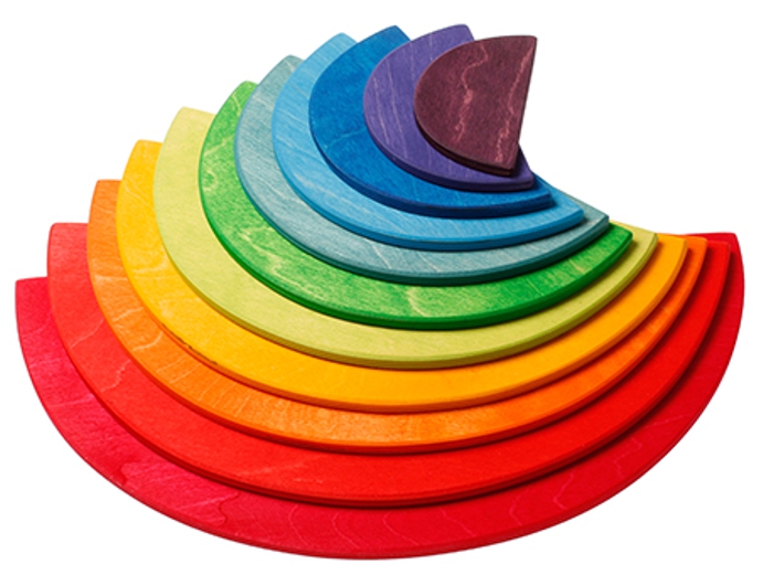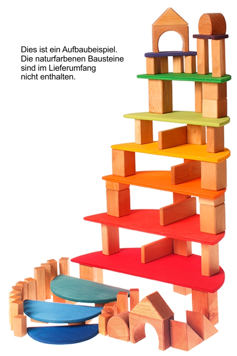 Die regenbogenfarbenen Halbkreise sind ein wunderbares und extra großes Bodenlegespiel. Zusammen mit den Bogenspielen von Grimms oder anderen Bauelementen entstehen originelle und flexible Puppenhäuser sowie vielseitige und moderne Architektur.