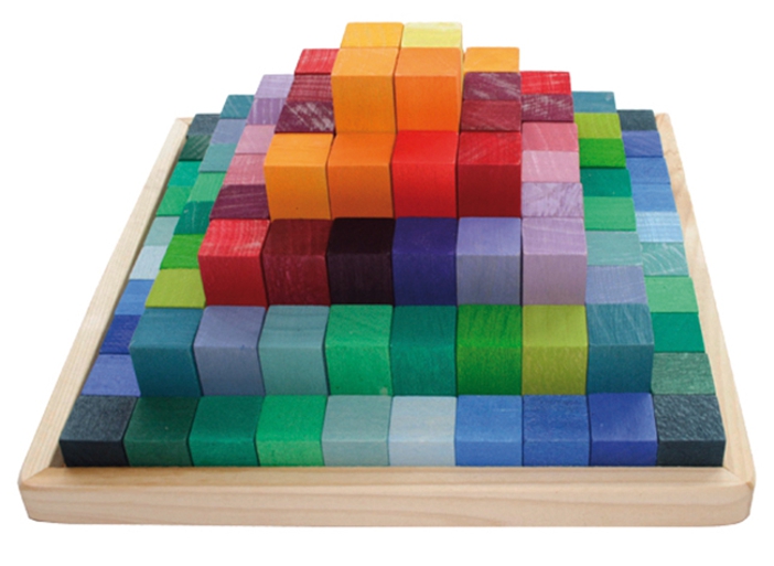 Die kleine Stufenpyramide von Grimms mit den bunten Farben ist schon für das Auge ein Genuss. Mit den Bausteinen lassen sich Burgen, Landschafen, Türme und Städte bauen. Neben dem hohen Spielwert vermitteln die Bausteine auch erste Erfahrungen mit Längen und Mengen und damit erste Grundlagen für die Mathematik.