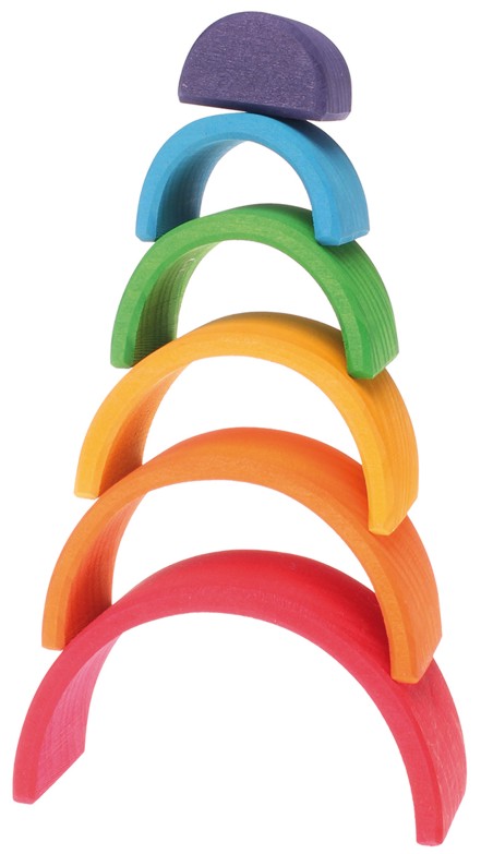 Der kleine Regenbogen ist ein sehr vielseitiges Spielzeug für alle Kinder ab 3 Jahren. Der Regenbogen kann eine kleine Puppen-Wiege sein, Zaun und Brücke, man kann Häuschen und Skulpturen damit bauen, und und und... . Der Regenbogen wird immer phantasievoll ins Spielen integriert sein, schauen Sie zu was Ihr Kind alles damit erfindet!