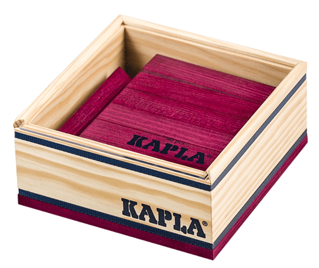 40 violette Kaplabausteine aus Pinienholz in einer kleinen Holzbox mit Klarsichtdeckel. Für den lila Farbtupfer in den Bauwerken mit Kaplabausteinen.