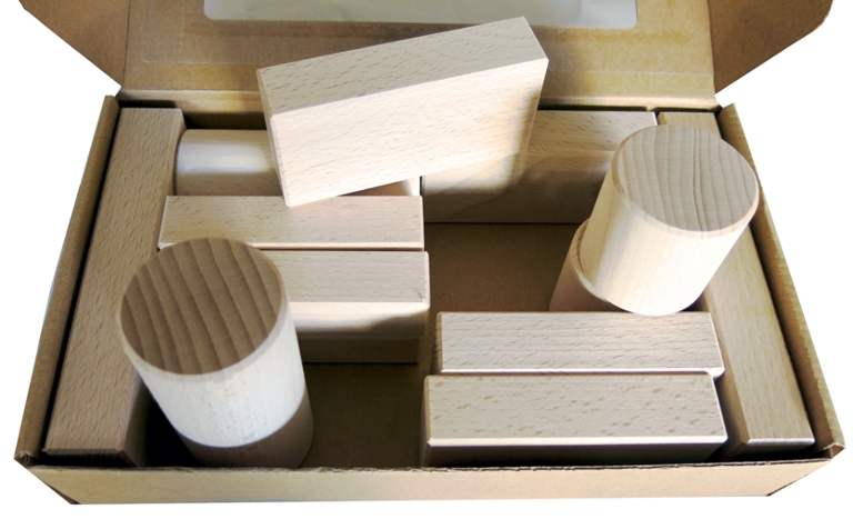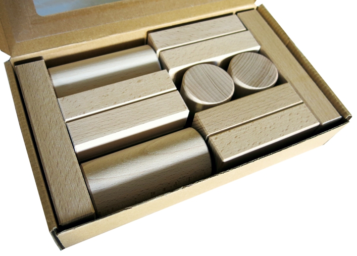 14 naturbelassene Holzbausteine im Karton mit Sichtfenster. Die Bausteine haben alle das Grundmaß der Fröbelbausteine (5 cm). Sie erhalten unbehandelte Bausteine aus Buche in bester Bruderhaus-Qualität.