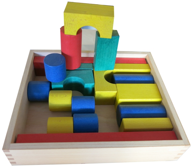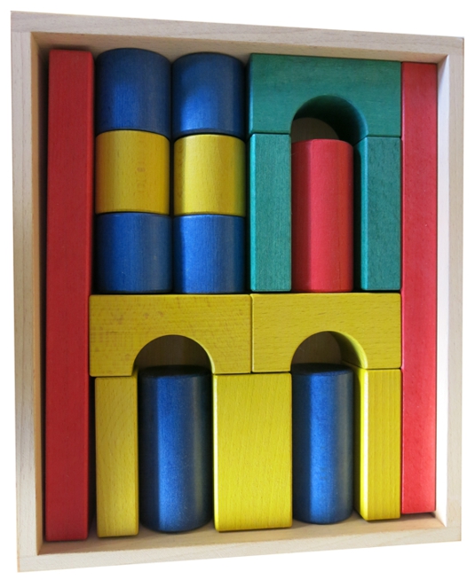 23 farbig lasierte Holzbausteine aus Buche im Holzkasten 08-40K3. Es handelt sich um Fröbelbausteine mit dem Grundmaß 5 cm. Der farblos lackierte, stapelbare Holzkasten misst 33 x 28 x 7 cm und hat zwei Griffmulden.