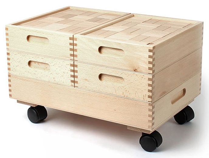 Der Wagen besteht aus 4 kleinen und 1 großen Kasten, die übereinander gestapelt sind. Insgesamt befinden sich in den Kästen 588 Bausteine aus Buche. Das Grundmaß der Quaderbausteine beträgt 3,33 cm.