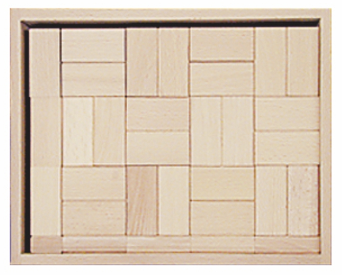 In den kleinen Kästen befinden sich jeweils 117 Bausteine mit den Maßen 6,66 x 3,33 x 1,66 cm. Im großen Kasten befinden sich 120 unterschiedliche Quaderbausteine (je 8 Längenbausteine 6-er, 5-er und 4-er, 24 Stück 3-er, 16 Stück 2-er und 56 halbe Steine).