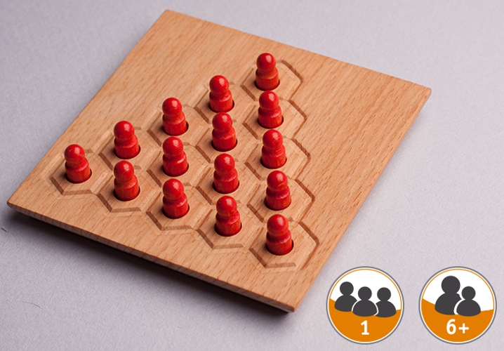 Der oberste Spielstein wird vom Brett genommen, dadurch entsteht ein freies Feld. Dann wird übersprungen - waagerecht oder diagonal - und der übersprungene Spielstein vom Brett genommen.